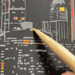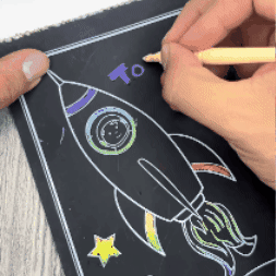 Al raspar la capa oscura del rollo con el lápiz, se revela un fondo de arcoíris vibrante: el efecto “mágico” está incorporado.